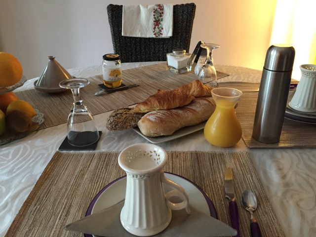 It is a cold day in Chateauneuf. The mistral is cold and strong. We woke up and had a perfect cafe au lait at a cafe/boulangerie around the corner. Our breakfast at Bridgette’s was scheduled for 9 am. Her home and the breakfast were nothing short of beautiful.