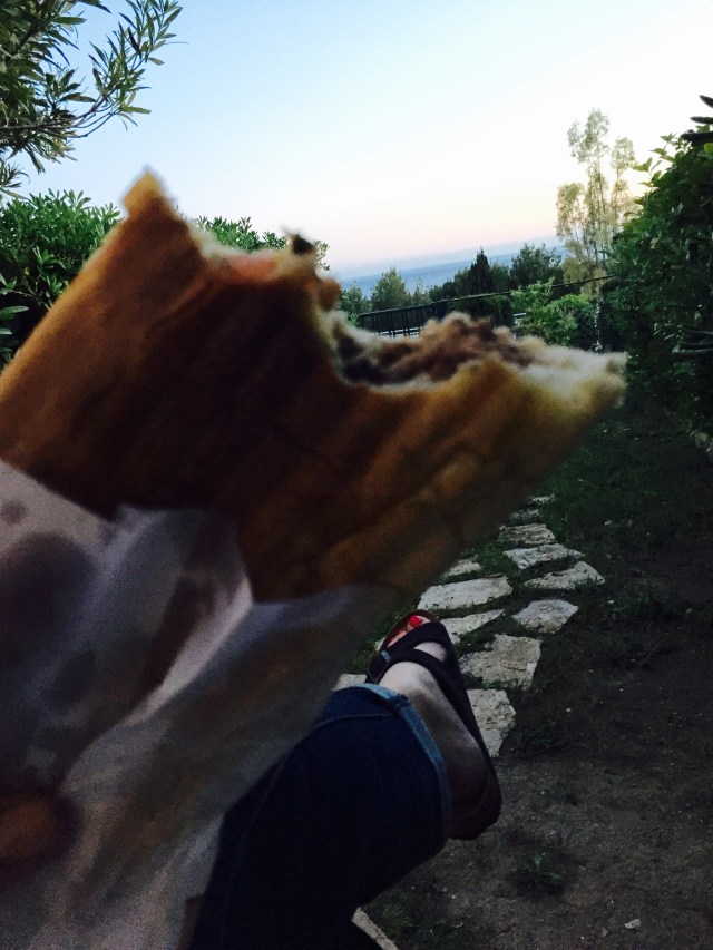 We picked up some more amazing wine and stopped at street vendor for what we thought were steak sandwiches. Turns out, they were hamburger and frites on a baguettes. With goat cheese! Yummmmmmmmmm. We ate them on our terrace. Perfect.
