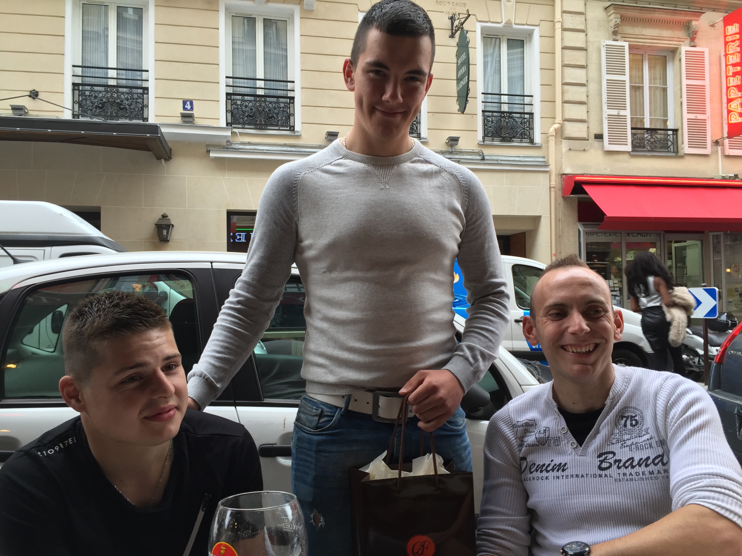 We walked the streets of Paris to get our bearings and spotted a brasserie that looked inviting. After a glass of wine and a wonderful French snack we met our new security detail for the rest of our stay. Three young strapping French army guys were sitting next to us and ready for some fun. Communication was fun and difficult at the same.